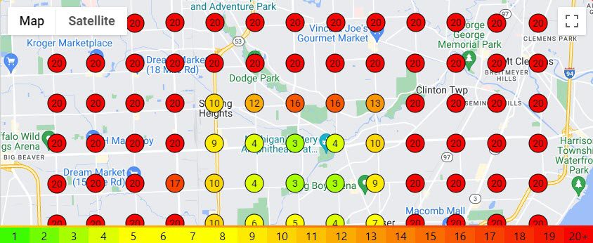 Fill out the form below to get your custom Ranking Heatmap. This visualization will display your business’s ranking across a 30-mile radius for your chosen primary keyword, similar to that shown below. We’ll run the analysis and be ready to explain the results at the booking time.